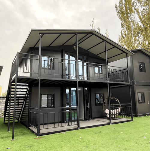 这是一栋总建筑面积100平米的现代工业风格集装箱改造房屋。 外观采用深灰色金属外壳搭配黑色框架结构。